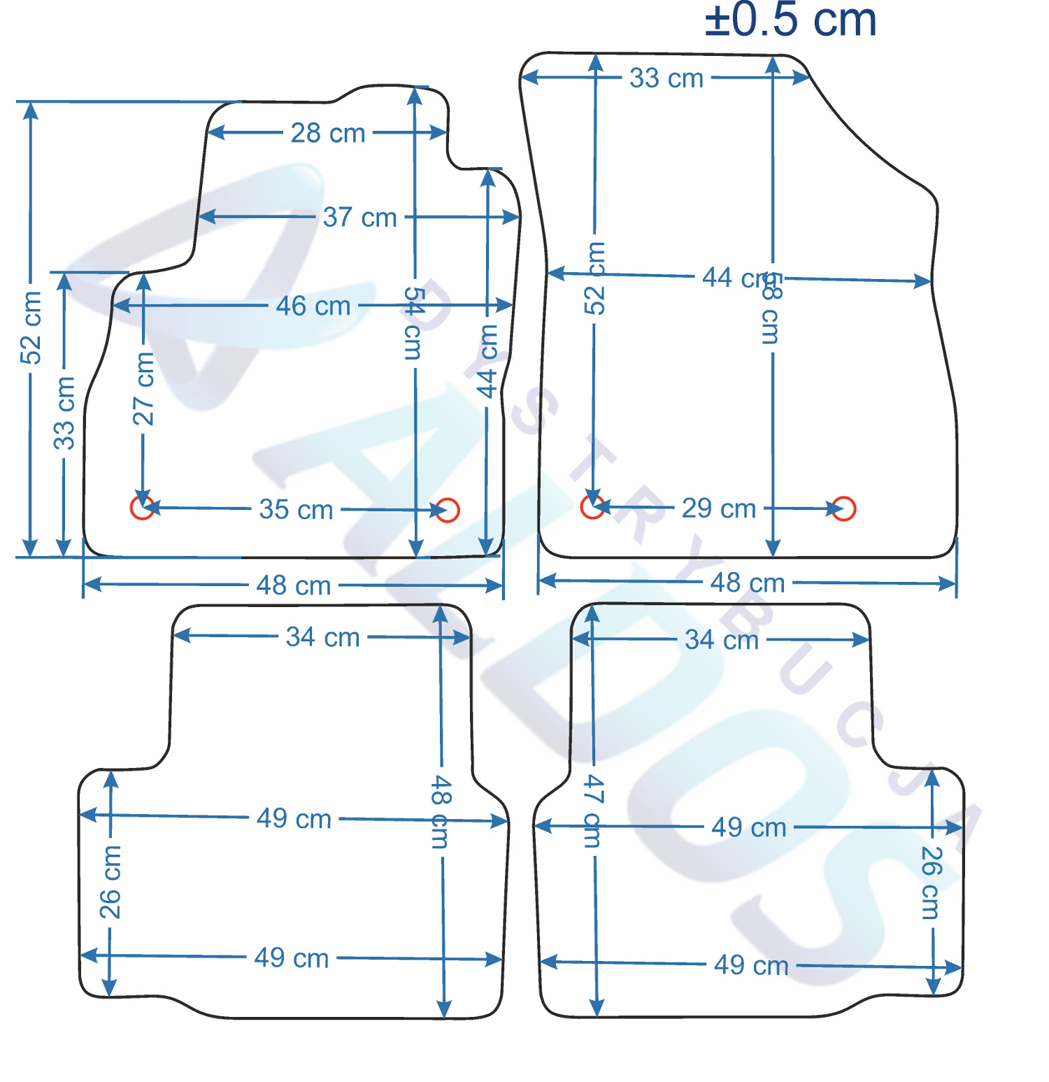 Dywaniki nie są oryginalnymi produktami OEM marki samochodu, a jedynie zamiennikami, które produkowane są przez Niemiecką Firmę PETEX.